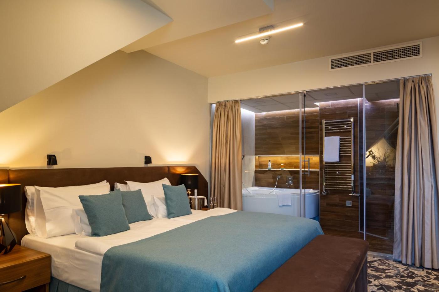 Deluxe Double Room with Bath. The double room includes a private bathroom fitted with a walk-in shower, a bath and a hairdryer. The spacious air-conditioned double room features a flat-screen TV with streaming services, a private entrance, a minibar, a tea and coffee maker as well as city views. The unit has 2 beds. ;