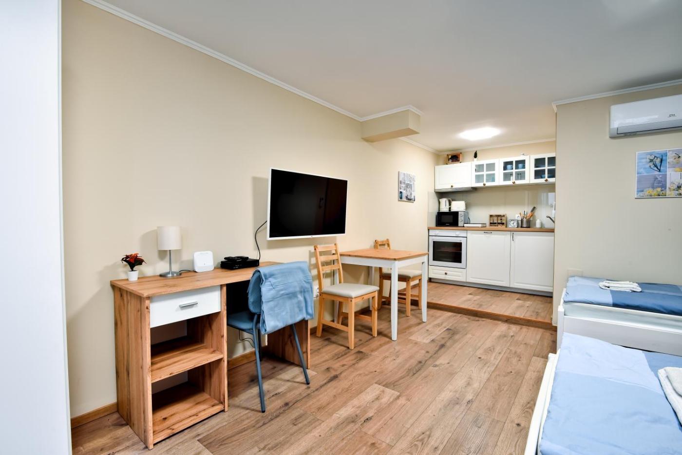 Apartment. The studio provides a dining area, a wardrobe, as well as a private bathroom boasting a shower and a hairdryer. Guests can make meals in the kitchen that features a stovetop, a refrigerator, a dishwasher and kitchenware. The studio features air conditioning, a washing machine, a private entrance, a tea and coffee maker, as well as a flat-screen TV with satellite channels. The unit has 3 beds. ;