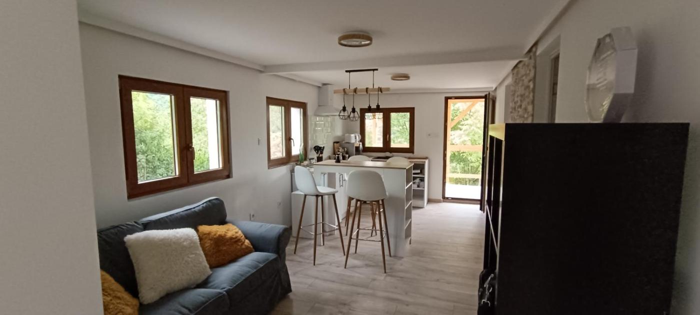 The holiday home with a terrace and mountain views features 2 bedrooms, a living room, a flat-screen TV, an equipped kitchen with an oven and a microwave, and 1 bathroom with a shower. Towels and bed linen are featured in the holiday home. The property has an outdoor dining area.